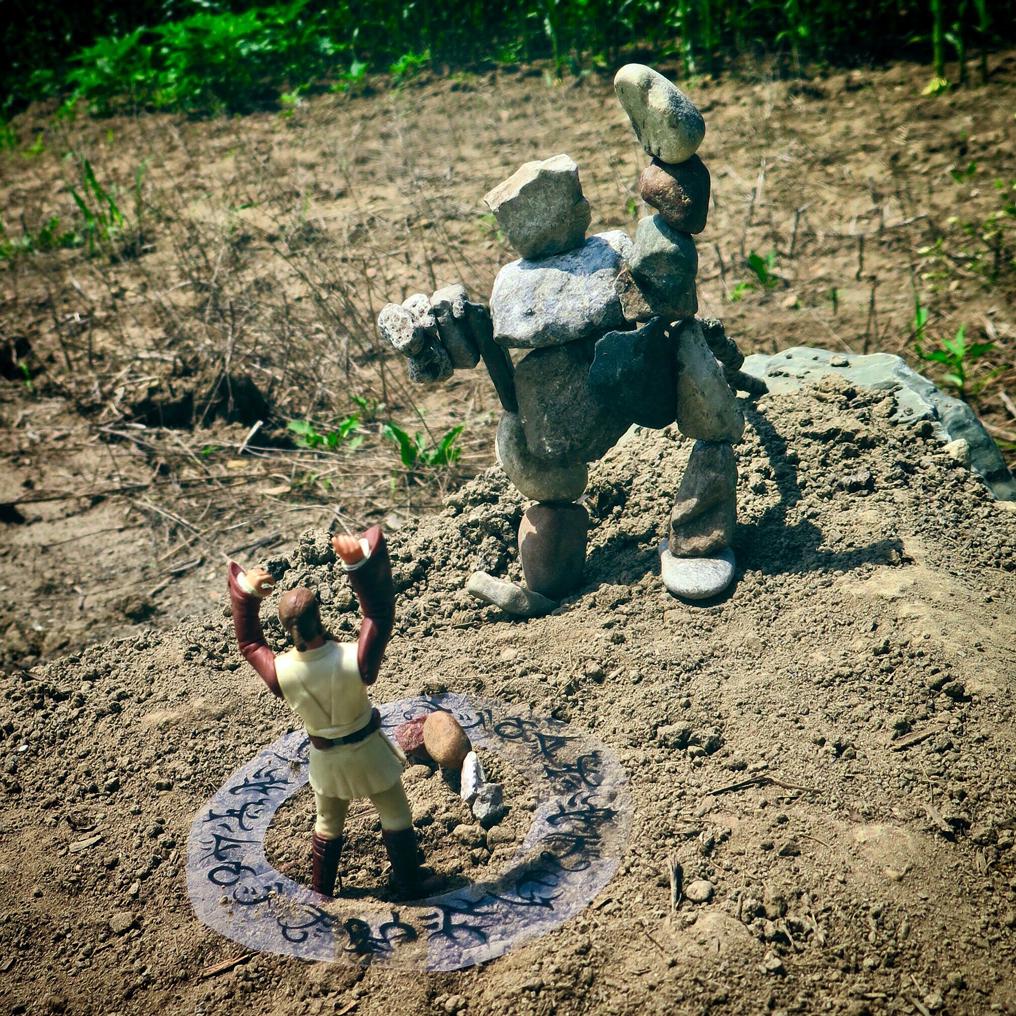 In other exciting news, Peter V. Brett’s ARC diorama contest winners were announced on the very same day as my birthday! Harkening back to my youth, I loved the idea of coming up with a diorama, eventually bombarding my coworkers with my potential concepts. I ended up choosing The Warded Man‘s iconic scene of Arlen crippling One Arm to attempt to as a diorama. To create a ward circle, I copied and pasted different wards that I could find online into our design software, eliminating their white background and arranging the images into a circle. I toyed with the medium to use for the base, e.g., colored paper, transparencies, white paper, and settled on a transparency as it would adapt readily to the background I ended up choosing. I attempted to clear coating Saran wrap tied around a basketball with spray paint give form to the barrier protecting Arlen, however that was a major failure. Adapting, I began to focus on my rock demon, which I wanted to be my centerpiece. I convinced my parents and grandma to help me scour the gravel driveway for stones that would work. I’m sure we made quite the sight! The process of super gluing the rocks together was frustrating to say the least, as I ended up with glue in my hair, all over my hands, and at one point on my tongue. As I am not overly artistic, hence the chemist background, I searched through my brothers’ old toys for an appropriate representation of Arlen. The angle I chose to take the picture was important as I didn’t want to make it obvious the character I was using (Anakin Skywalker). In that way the viewer could pretend at least that he was the hero from The Demon Cycle Series. Once I had all my individual pieces ready, I set them up on a massive rock at the edge of my parent’s cornfield to give a rural background to the image. If you look closely, my fragile rock demon is propped up by a stick as we were all concerned with him toppling over. I submitted my final entry into the contest in late July and waited with bated breath. As such, it was a wonderful birthday surprise that I was selected as one of the winners of the ARC books! I couldn’t wait to get The Core in the mail and have been devouring it every since finding the anticipated package in my mailbox! With 100 or so pages to go, I’m absolutely loving this action packed final installment of the Demon Cycle Series! Stay tuned for a review later this week!