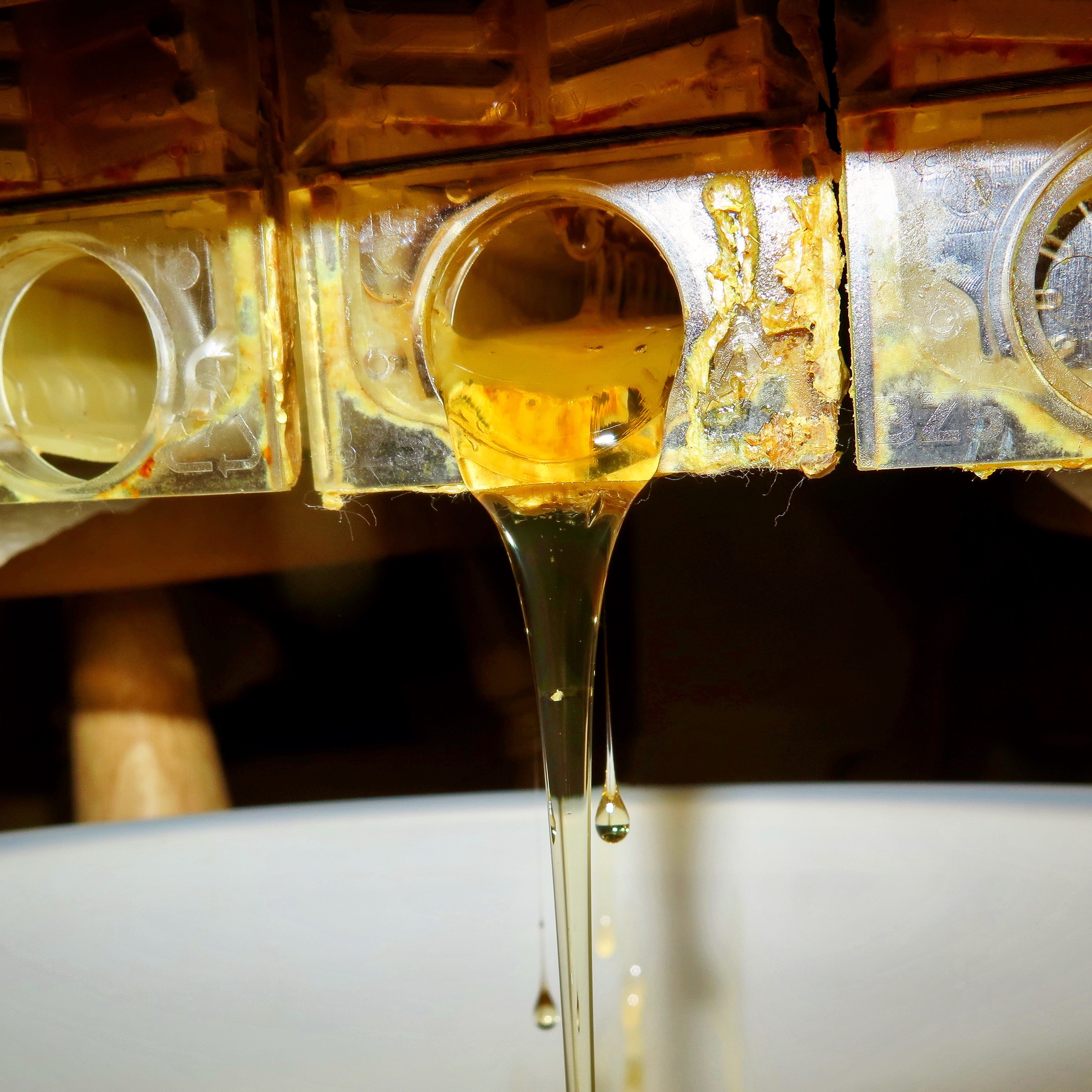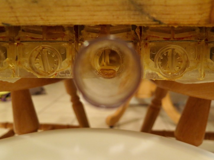 We continued with the harvest by opening up the first frame as you can see in the image below, with the honey is dripping down, before flowing out into the waiting container. Almost immediately leaking occurred, however the renegade viscous fluid was unexpectedly issuing forth from the surface of the frames as you can see in the video below.  The video is showing the underside of the Flow Hive frames, in which you can observe the aforementioned leaking occuring when harvesting three of the seven frames.  We caught as much of the errant honey as possible through an assortment of Tupperware containers, with approximately one pound of honey being collected.