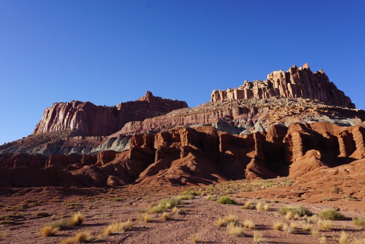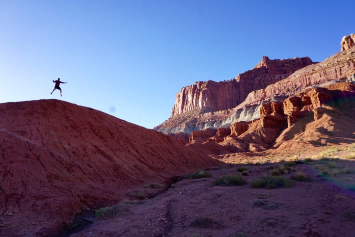 Over Memorial Day, my brother Samuel was moving back to Michigan from San Francisco so we got a chance to go on another fantastic, jam packed road trip hitting eight National Parks in four days. Our busy second day of the trip thus far had included hiking to the top of Angel’s Landing at Zion National Park and taking the scenic drive at Bryce Canyon National Park. As Capitol Reef National Park was only two hours from Bryce Canyon we decided to fit in this third park into our already full day.  At this point I’d had to don a long sleeve as I’d made the mistake so many Michiganders do after a long winter. Due to a delayed spring, so even though I’d applied sunscreen, the Utah sun was most unforgiving to my shoulders when hiking at Zion.  After our relatively short drive we finally reached Capitol Reef and even though the Ranger Station had already close,  we plotted our own mini adventure in the time we had before sunset.