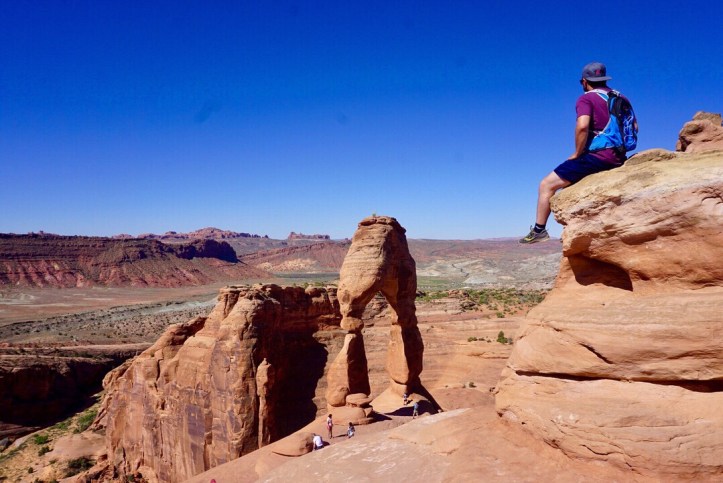The three miles to Delicate Arch were by no means leisurely.  Make sure to bring plenty of water as there is little shade and the Utah sun is brutal.  The sandy rock makes it easy to slip and as you get closer to this remarkable structure you have to walk along several steep drop offs.  That being said, it was absolutely worth it! This beautiful arch seems to defy nature at it stands at the edge of a cliff with the whole basin sloping downhill toward the drop off. For some reason I couldn’t seem to maintain my center of balance and sat down every chance I could get as we observed this remarkable landmark.  Samuel couldn’t help but laugh at my discomfort as he walked around relaxed.  The crowds were comprised of a wide range of ages, with a surprising number of children running around. Fellow hikers lined up orderly to get their photo next to the Arch, which was a nice sentiment but was spoiled with every group taking approximately five photos in different locations at the base, causing the pace to be painfully slow in that heat.  Plus, it was impossible to explore or touch the arch due to the photo shoots taking place, as you’d potentially getting in someone’s picture.  Samuel and I made the best of it finding unique viewpoints and adventuring away from the conventional spots.  Regardless, this structure was breathtaking from any angle that you managed to observe making the walk totally worth it.