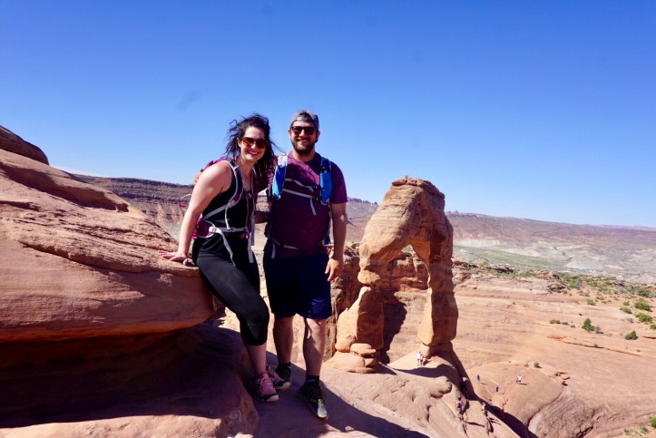 Over Memorial Day, Samuel was moving back to Michigan from San Francisco so we got a chance to go on another fantastic, jam packed road trip hitting eight National Parks in four days. In my last post we had just finished the busiest day of our trip where we fit in hiking to Angel’s Landing in Zion National Park before taking the scenic drive at Bryce Canyon National Park and finishing our day at Capitol Reef National Park.  After completing our Grand Wash hike we hopped in our car to drive a bit closer to Arches National Park. Samuel knew from previous experiences that Arches can be incredibly busy, especially since it was a holiday weekend.  We made sure to get up early to be in line for the park right after opening.  Once in the park we drove straight to Delicate Arch to complete the three mile hike as we knew this popular hike would only get busier as the day progressed.