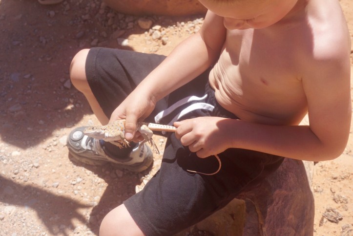 Samuel and I wanted to fit in one more hike before hitting the road again so after Delicate Arch we drive to the Devil’s Garden Trailhead.  We had the goal of reaching Landscape Arch, the largest arch in the world, but maintained the potential continuing on to see the Double O Arch or the Dark Angel, which were a much farther hike.  The hike to Landscape Arch was an easy, relatively flat 1.5 miles, however the difficulty significantly increased by continuing on to the Double O Arch, not only due to the increased mileage (4.1 miles round trip) but also for elevation gain and steep drop offs.  Landscape Arch itself was just as stunning as Delicate Arch as it also seemed to defy nature but in a different manner. It seemed unreal that this massive arch could withstand its own bulk as it seemed to stretch horizontally.  After spending a bit of time soaking in this sprawling arch we chose to turn back in lieu of continuing on, as we had both started to get hungry. On the walk back we were able to observe several critters as a young boy caught a rather large lizard and a huge gopher snake crossed the path right in front of us. I had quite the start as the young girl next to me emitted a blood curling yell and ran back the opposite direction at the firs sight of this lengthy snake. Once we reached the start of the trailhead, we overheard an interesting conversation from a nearby family and found out the park had actually closed around 9:30 am due to reaching their quota of visitors.  We were indeed thankful that we got up so early! Unfortunately for this family, they were separated from a second half of their group that chose to go get a late breakfast before the entering the park.