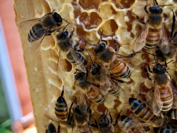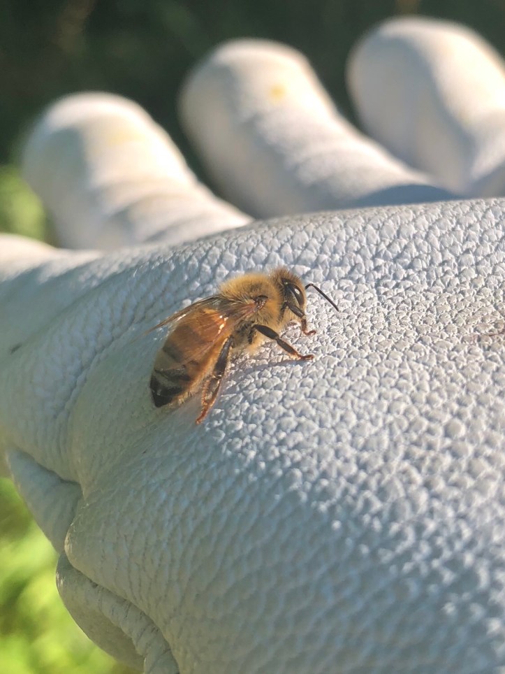 We started out this year with five hives, three Carniolans and and two of the new hybrids Saskatraz, with the weather proving to be quite a hurdle early on with icy, snowy temperatures. Despite the hives all looking healthy early on, one of our Saskatraz queens died and unfortunately we didn’t catch it with enough to save the hive. Once down to four hives we were more vigilant regarding the health of the hives, spotting the death of a second queen, this time a Carniolan with enough time to try to save the hive. In our three years as beekeepers we had not replaced a queen mid season before so we were a bit nervous. We overnighted our new queen, getting a phone call from the local Post Office at 7AM that she’d arrived. Going to the back dock of the local post office, I was surprised at the little box she arrived in as you can see in the photo below. The next day, Luke and I drove down to my parents where we installed her in her new home. A little over a month later, with her first brood having now hatched, the population in this hive has remarkably rebounded. They are well on their way to having enough honey to survive the winter. In the closeup below of her little cage, you can spot the queen by the red mark on her back.