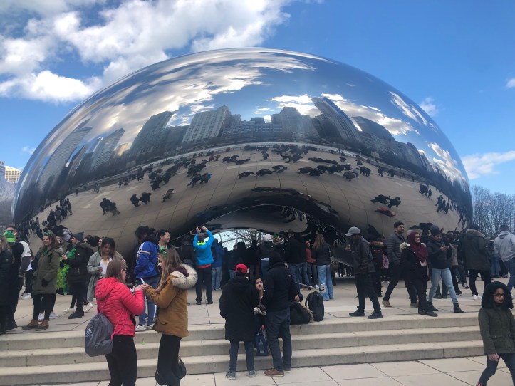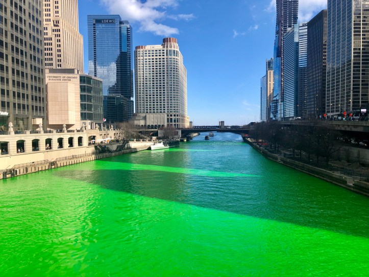 Although none of us had personally been in Chicago for the popular holiday, we’d seen many photos splashed across social media of the iconic green river that has been a city tradition over half a century. I’d always assumed the river images were enhanced to give the green its bright fluorescent color, however I was shocked to find the hue to be true to the aforementioned pictures, as can be seen below.  From our hotel room we had a beautiful view of the river and the thousands of people who were crossing the DuSable Bridge. As we had several hours to pass before the start of our concert we ventured down to join the masses in hitting a few of Chicago’s go to tourist attractions.