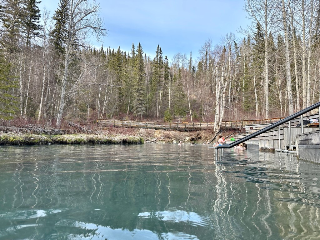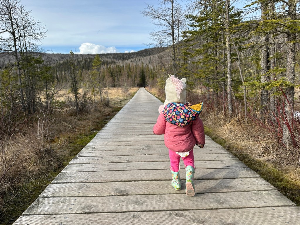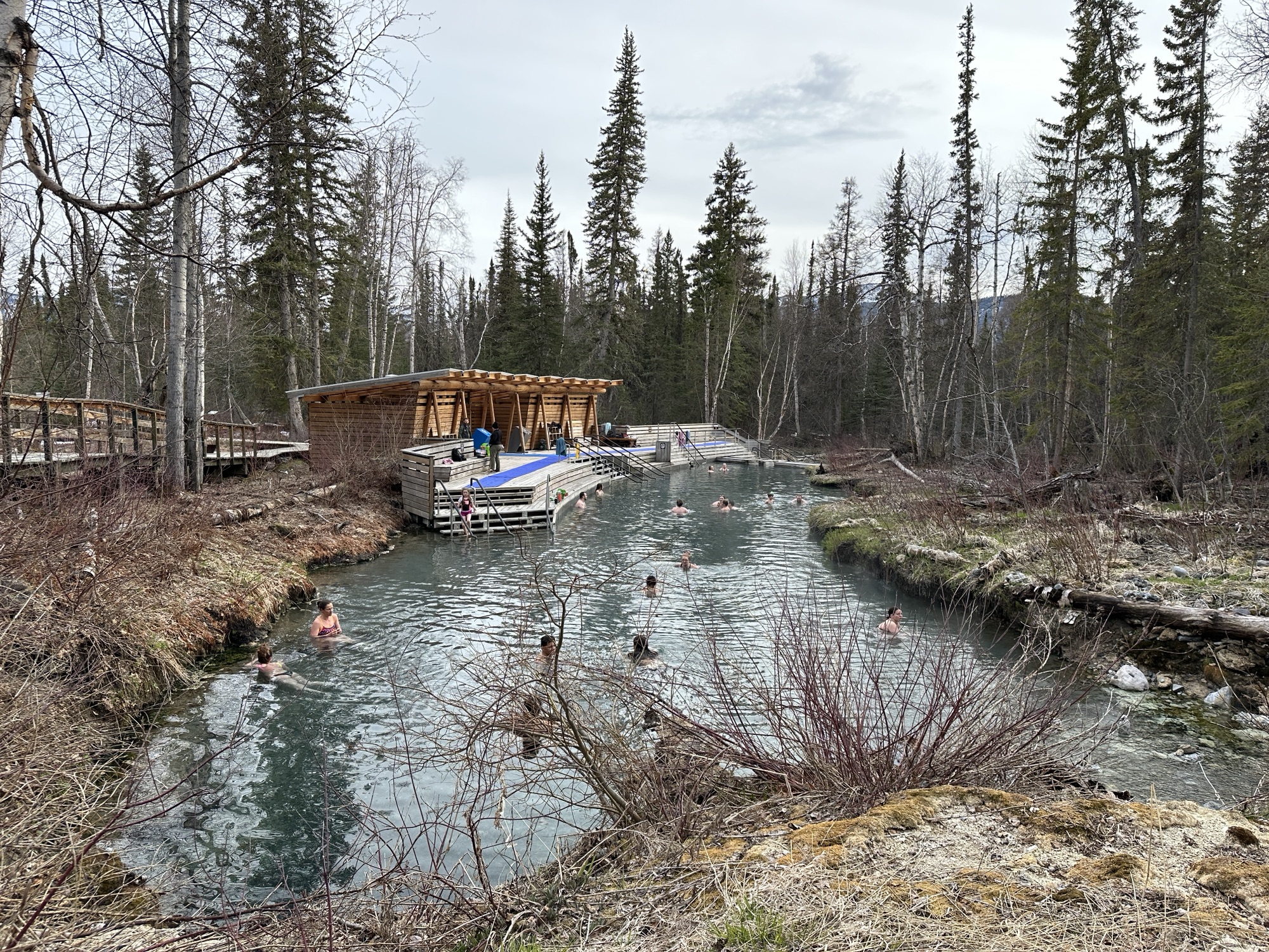 Just after Watson Lake, we left the Yukon and entered British Columbia. Two hours later we stopped at Laird Hotsprings Provincial Park. In recent years there have been two deadly grizzly bear attacks at this park, which kept us on alert, though the parking lot is closed off with electrical fencing for safety. To reach the springs you have to leave the fenced in area by opening a heavy gate and then hiking on a boardwalk 700 m before getting to the gorgeous hot springs. The parking lot and beginning of the walkway was surrounded by snow. It wasn’t long before the boardwalk back to the springs drastically changed scenery. The spring fed swamp was green and steaming, with a moose munching away on the foliage in the distance. Quite skeptical, only Samuel, who is the most adventurous of us, grabbed his swimming gear. Leaving the swamp, we emerged through the woods into a newly built building that bordered the hot river. After seeing the settings and feeling the delightfully warm water, we all trekked back to the car to get our swimming gear. Quite pregnant at this point and reading conflicting guidance on hot springs, the guys scouted an area where the water was bath warm, so we could all enjoy along with the kids. Quinn and Ty loved it and had a lot of fun splashing each other. Getting changed, while pregnant in the unheated changing rooms was quite frigid but the water was so worth it. Granted, getting out and dressed again with a toddler was rather challenging. Quinn is still talking about it a year later though.