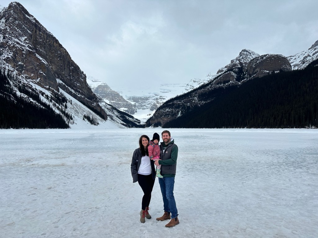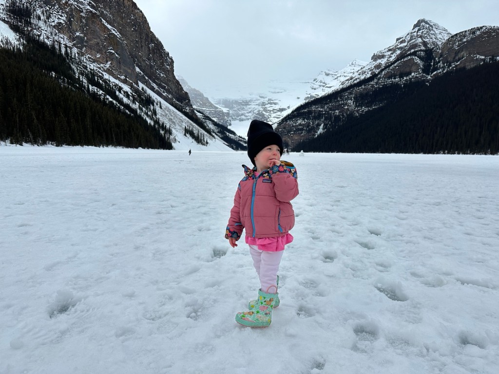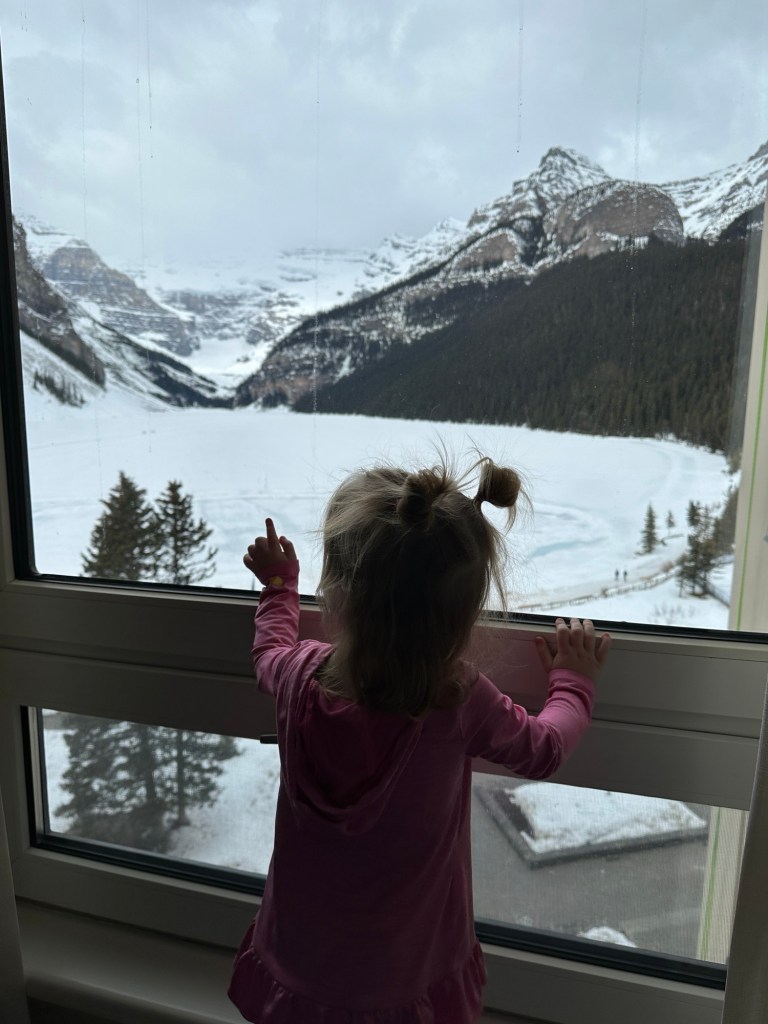 We left Grand Prairie and headed toward Jasper and Banff National Parks, where we would be staying at the much lauded Fairmont Chateau Lake Louise (6 hours 45 minutes). Through the heart of the Canadian Rockies, this drive is hard to capture in words as it is so very breathtaking. Unfortunately, Luke slept through most of Jasper National Park as he had started feeling sick so I look over driving for a few hours. The mountains on either side of the drive were unlike anything I’d seen before with their sharp, jagged peaks. Four hours into our drive, we stopped to get lunch at Jasper Brewing Company. Once we were in Jasper, Quinn’s stomach bug migrated to her bowels. I will forever associate Jasper National Park with Quinn and her stomach issues. At this point of the drive there were steep snowdrifts still on either side of the roads. We would be driving around gorgeous scenery before all of a sudden hearing a terrible noise from the back seat. Quinn was changed in Jasper at least five times, with a few of them requiring her to be propped up on snow drifts.