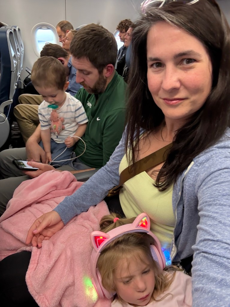 Finally at 7PM, we boarded our flight, only to have the gate agent tell us that there was no room for our carry-ons and they would need to be checked. Even though we were able to keep them with us on the first flight, the agent was adamant. So we relented, only to find the overhead space was barely full. Already exasperated with the long day and not having our bags, our helplessness grew when the pilot came over the speaker just as we’d sat down to let us know we’d been delayed again. Over the next three hours we met with a series of delays from needing to find new pilots and getting more fuel to needing to be taxied out. The kids were both at the ends of their patience as they’d been champs most of the day. In the meantime, I was frantically checking our connecting flight to see what was happening there as we were cutting it close. We also were in contact with the car rental company to let them know of the delays. Finally, at 10 PM, with both kids becoming quite fussy (understandably so), the plane pulled away from the gate, and with the lights dimming, Quinn and Rhett were fast asleep within minutes. The crew on this flight were fantastic! They went above and beyond, getting everyone snacks and radiated such positivity throughout the long day.