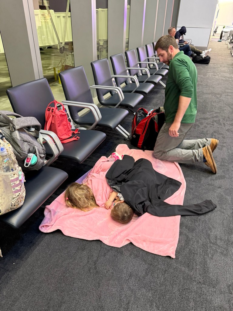Luke and I carried the kids to a quiet area of the airport and laid them out on a blanket. It was so very cold, but with being separated from our luggage, our extra layers were limited. Luke took the first shift, while I snuggled between the kids. The kids slept soundly, with Rhett sleeping almost to 8:30 am and Quinn only waking up a few minutes before him. Exhausted and frozen, we made our way to our next gate, only to find out our next flight was also delayed. At this point, the nightmare of a travel day seemed like it was never going to end.