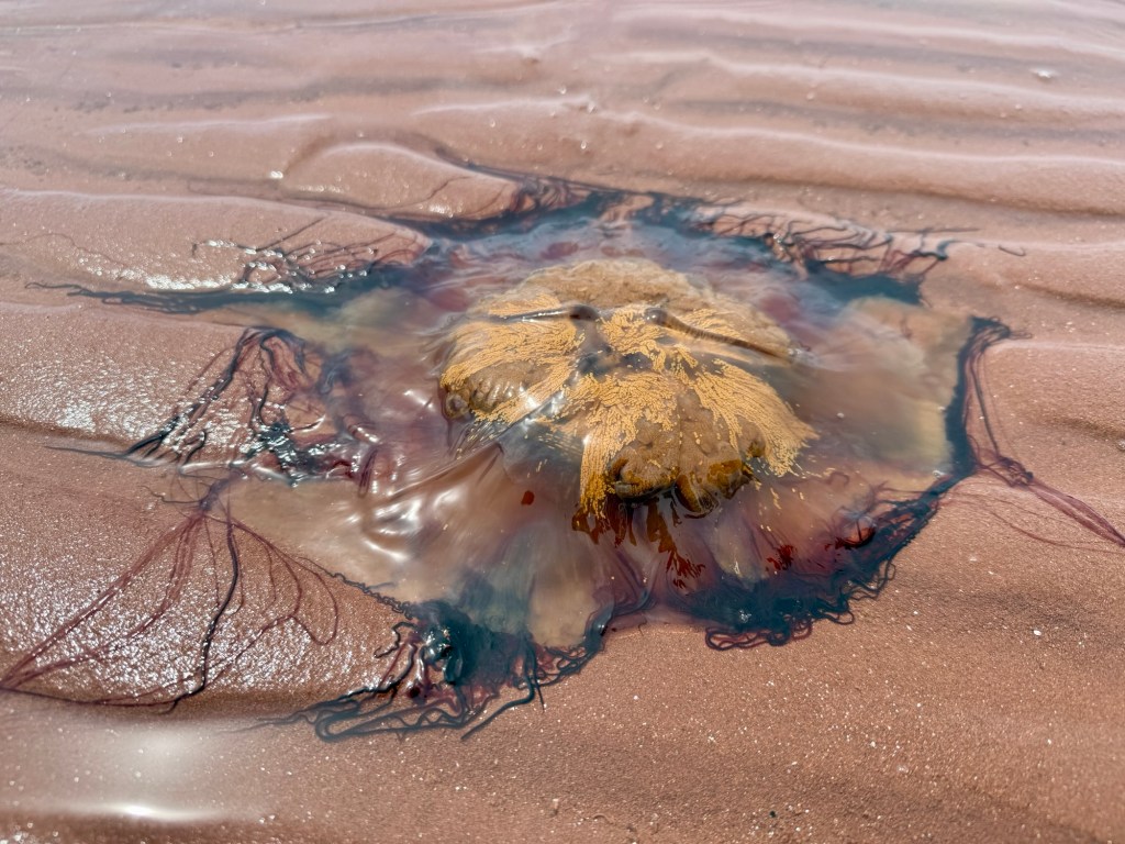Thanks to a recommendation from our waitress at the Blue Mussel Cafe, we detoured to Canoe Cove the next morning at low tide. Our waitress had said it was her favorite beach when she was a kid because the tide pools were amazing. She wasn’t kidding and Canoe Cove was my favorite stop of the whole trip. One piece that stands out was that so far in the trip we’d thought we’d seen red sand beaches, but they were nothing compared to the Canoe Cove sand that was a deep dark red. We arrived just as the waters were receding so the tide pools were being created as we were exploring. We saw a small crab scurrying away and Quinn found the tiniest of starfish. Our favorite finds were huge jellyfish with wild colors on the inside. You could spend hours just walking and exploring. The kids (and me) had a blast.