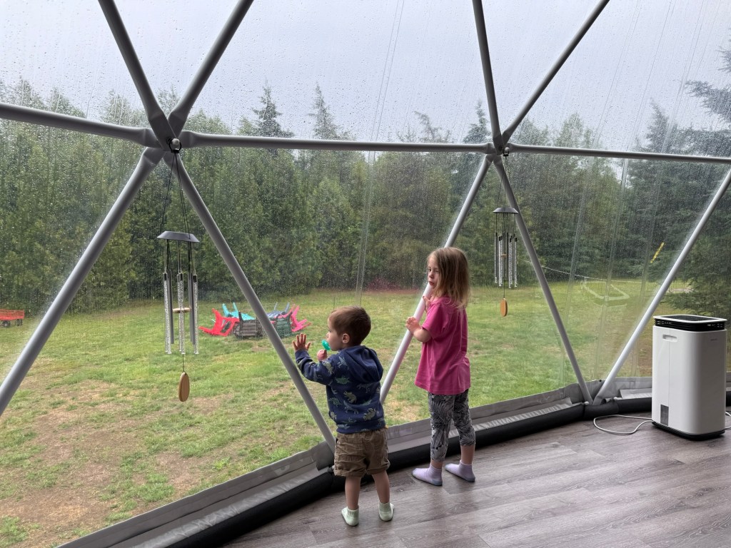 Back at the dome it continued to rain most of the night. Luke was up late working and Rhett woke up around 1 with his first ever night terror. It was a horrible experience and there was just no consoling him and he didn’t want to be touched at all. What I’ve left out of the story so far was that just three days before our trip, Rhett and I had to make a trip to the emergency room after a fall at bedtime. He had split his lip and needed several stitches. I’m usually a very relaxed parent, but with his lip still so tender and the stitches still healing I was a mess of anxiety as Rhett thrashed about. Eventually Rhett settled and went back to sleep but there was little to no sleep for me, especially with Quinn waking up at dawn. Quinn and I had a lovely morning sitting along the windows of the dome, eating our cereal, and watching the rain continue. We had a lot of fun looking for wildlife and seeing if we might spot any bears walking into our clearing. Quinn loved the dome, and months later when we talk about this trip she tells me all about staying in the dome.