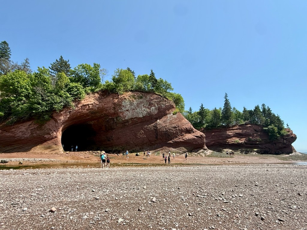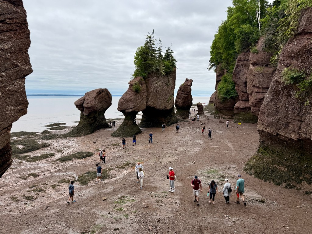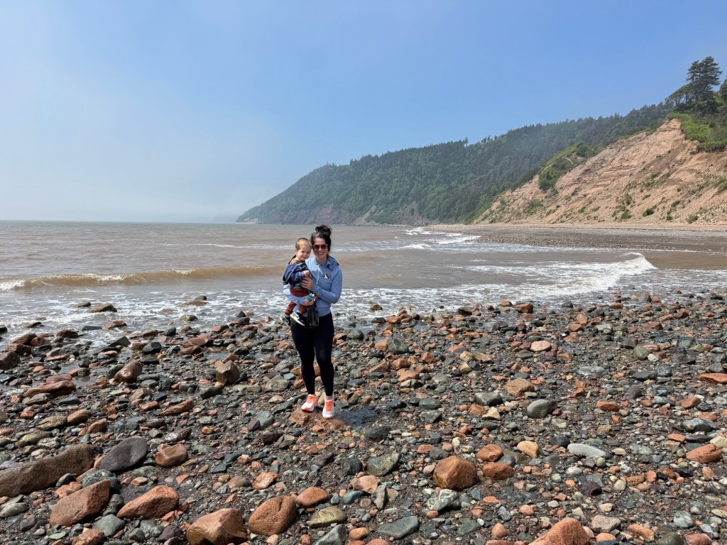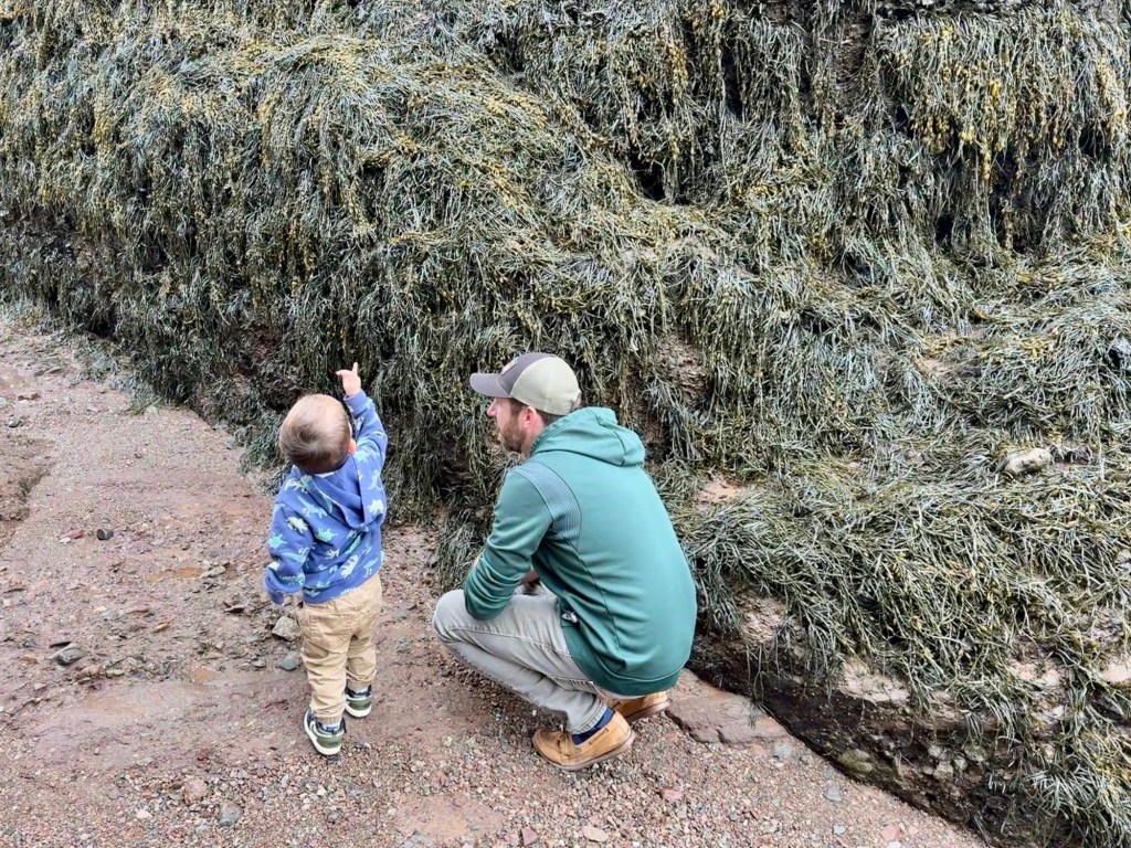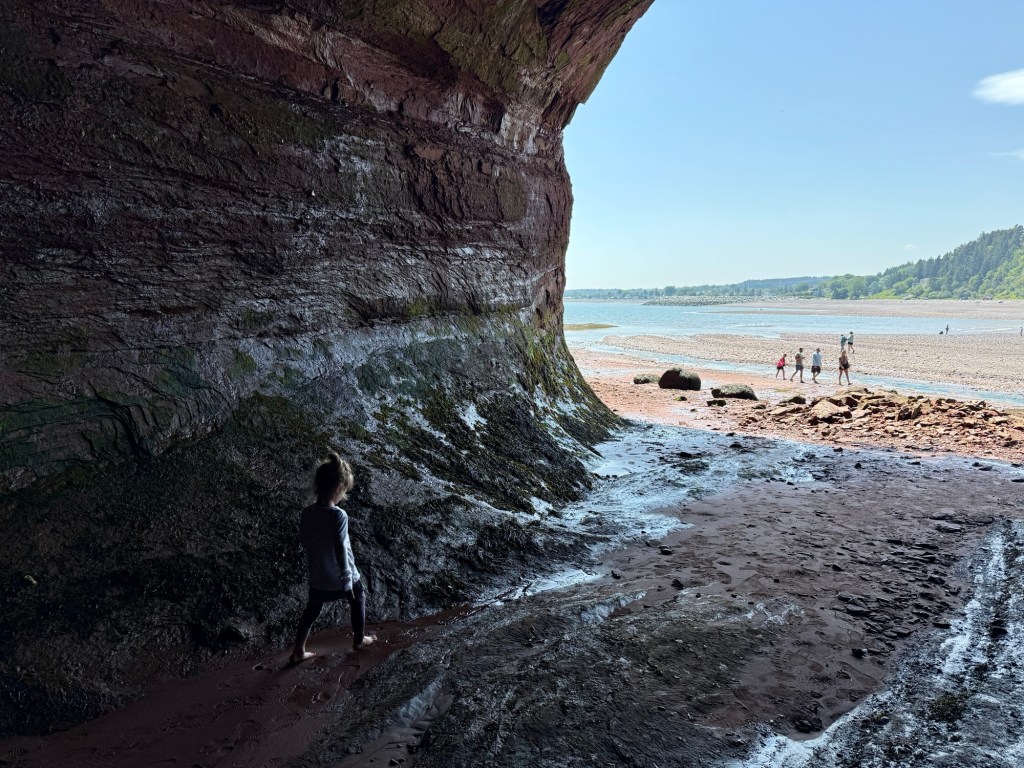 On the way to Alma was Hopewell Rocks Provincial Park, which was one of my most anticipated stops of the trip. Hopewell Rocks Provincial Park is such an iconic spot to view the record breaking tides of this area. Due to the appeal, it should surprise no one that this spot draws huge crowds and as a result was one of Luke’s least favorite spots of the trip. We arrived a couple of hours before low tide, but we were still able to walk on the ocean floor. Even though we were not there at peak time, there were still a ton of people. Thus far on our roadtrip we had almost every spot to ourselves, so it is always an adjustment to have to deal with other people. While the timing worked well for us tide wise, the kids were mid nap. This made walking for Quinn a dramatic request, though as soon as we got to the stairs Quinn couldn’t wait to explore. Walking around the ocean floor was a muddy affair with both kids getting covered in the bright red sand/mud.