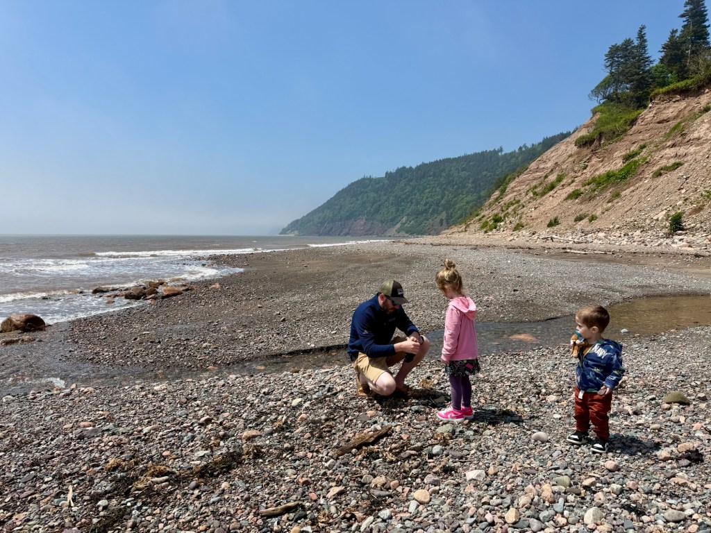 After dinner we headed out Point Wolfe Beach in the Fundy National Park with the tide coming in. We were surprised that the park was not as remote as we’d anticipated. There was a pool and golf course, along with many other amenities. It did not have the traditional national park feel we are used to. Point Wolfe Beach was a short walk downhill, but with evening coming on, so did the slugs. Quinn was equal parts delighted and grossed out with the bright yellow slugs that we were having to zig zag around on the path. This scenic beach was all stones, much to the delight of Rhett. We spent a peaceful hour watching the sun set, while Rhett practiced throwing rocks as far as he could.