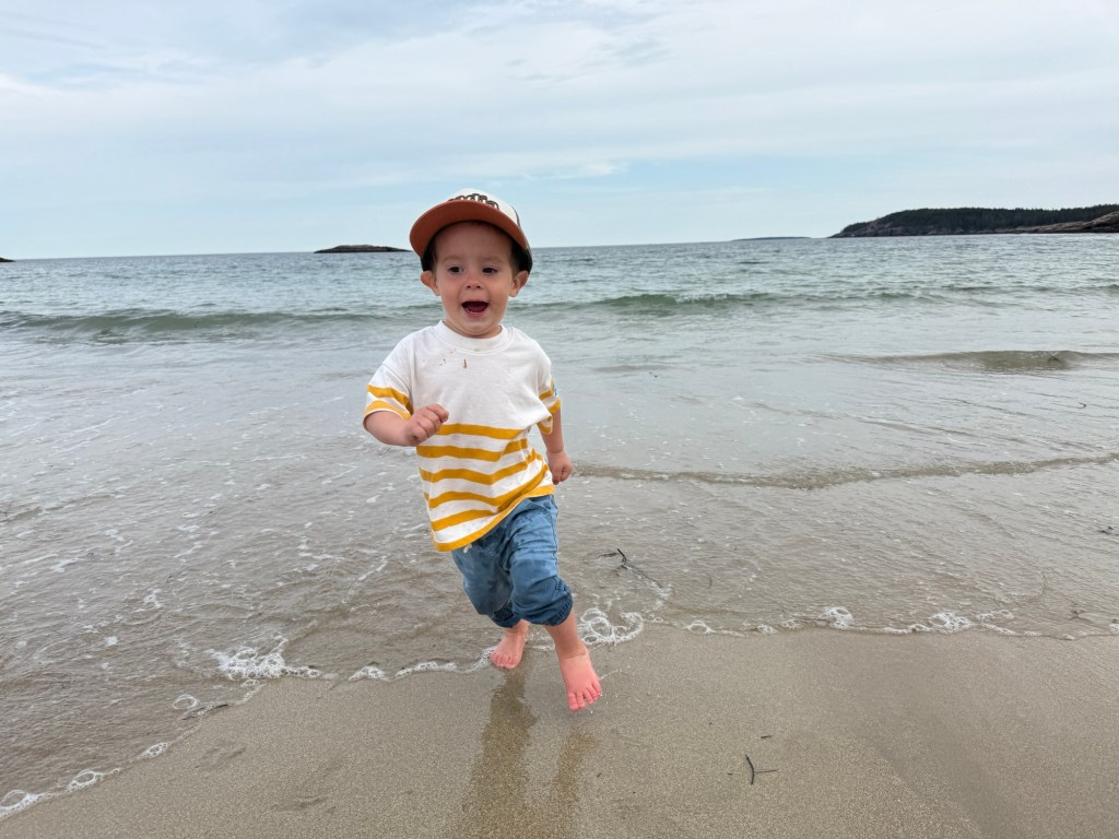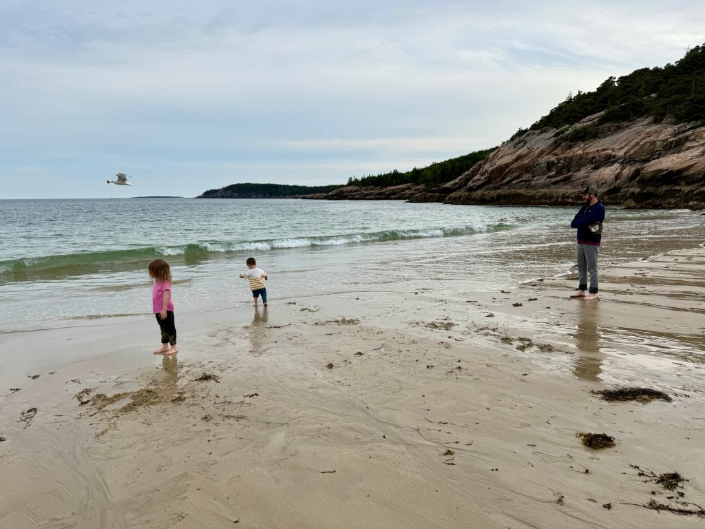 After our tour we continued to drive around the park to South West Harbor. After stopping for ice cream at the Salt Shop, we turned back to the more popular part of the park. In the morning when we’d driven the Park Loop Road it was pure chaos. Cars were everywhere. Now as it was closer to seven at night, we had the luxury of having the park to ourselves. Exhausted after our long day, our only stop was Sand Beach and we were so very happy we did. Well to be completely honest, Quinn was initially over the action packed day and was adamant that she did not want to go to the beach. As soon as her toes touched the water though she was full of joy and laughter. Rhett and Quinn got thoroughly soaked and sand covered one last time. It was such a fitting end to the trip. They had so much fun running in the waves. The beach itself was stunning. No wonder it is such a popular destination at Acadia National Park. We were grateful that it felt like we had the beach to ourselves. Tired and happy, we drove through Bar Harbor and made our way back to the AirBNB to pack for our flight the next evening.